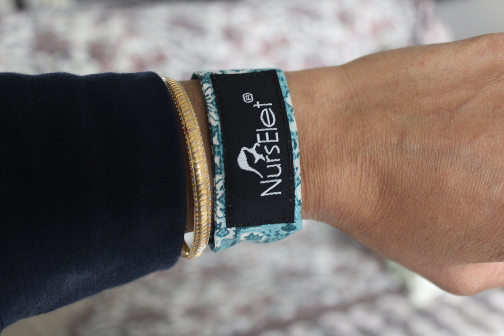 NursElet® Nursing Bracelet holds mother’s shirt up while nursing or pumping that can also be used as a nursing reminder bracelet.