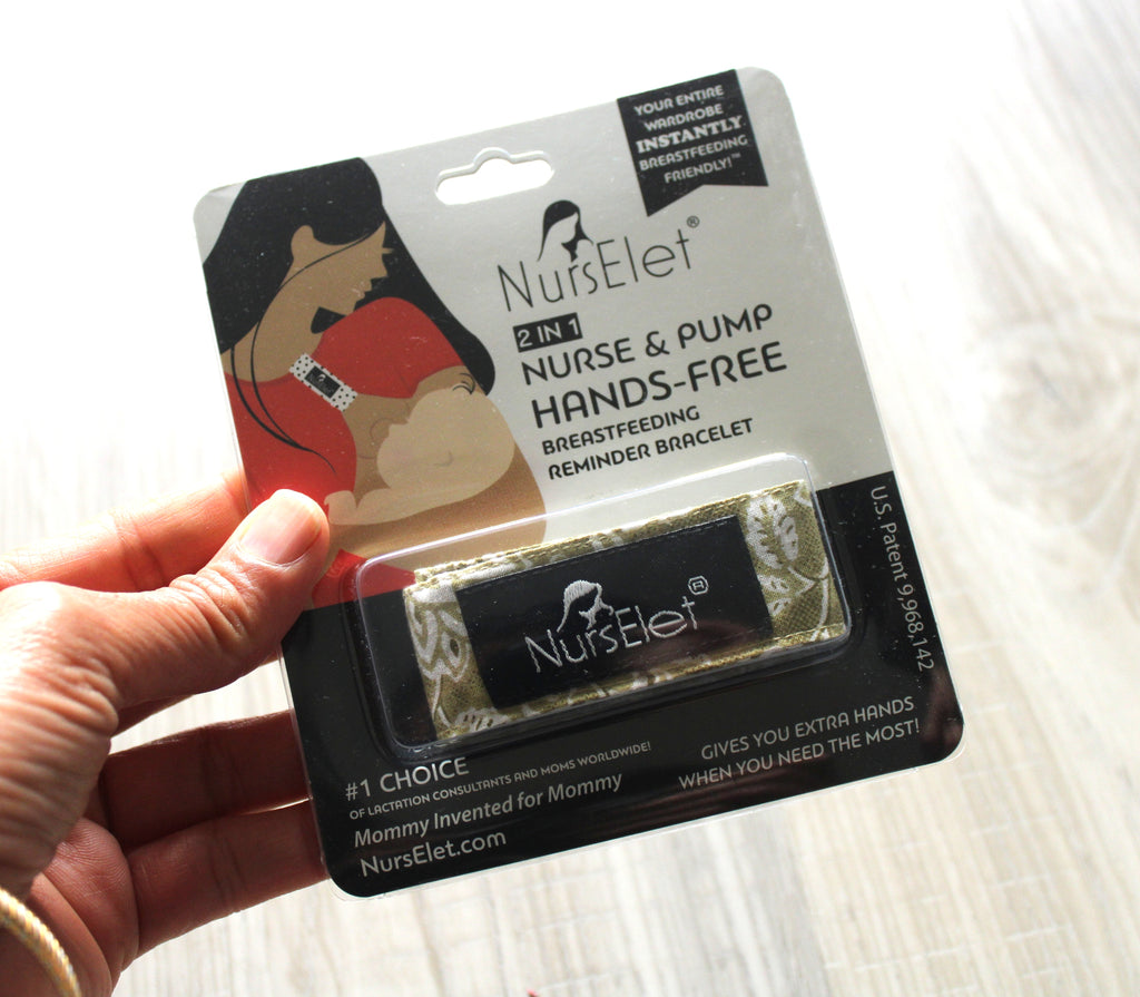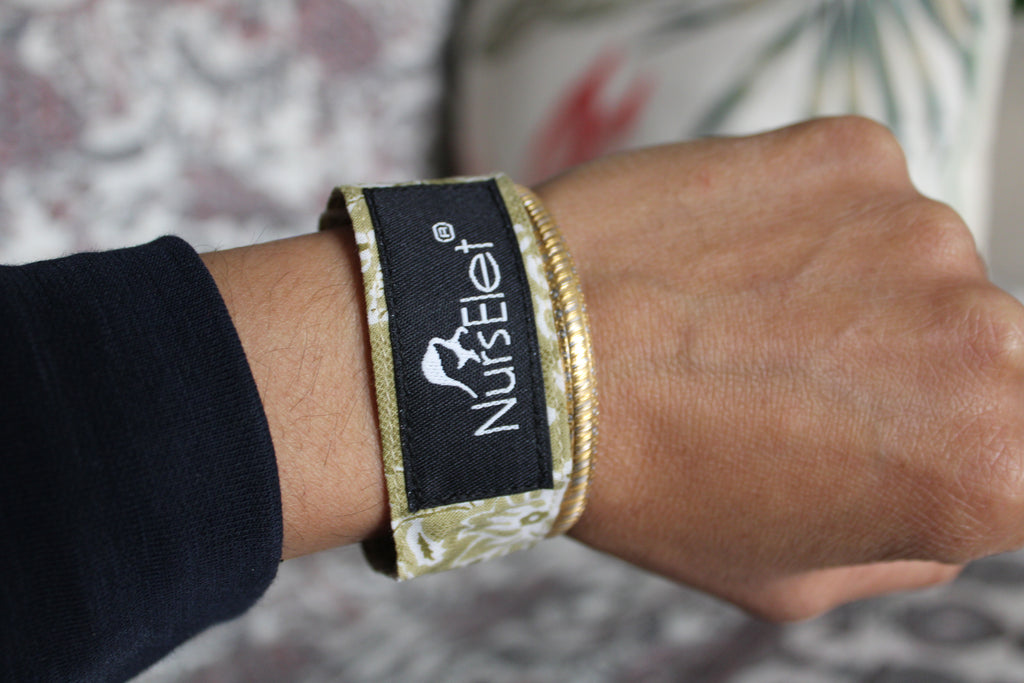 NursElet® Nursing Bracelet holds mother’s shirt up while nursing or pumping that can also be used as a nursing reminder bracelet.